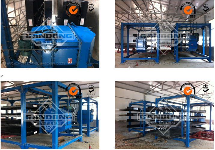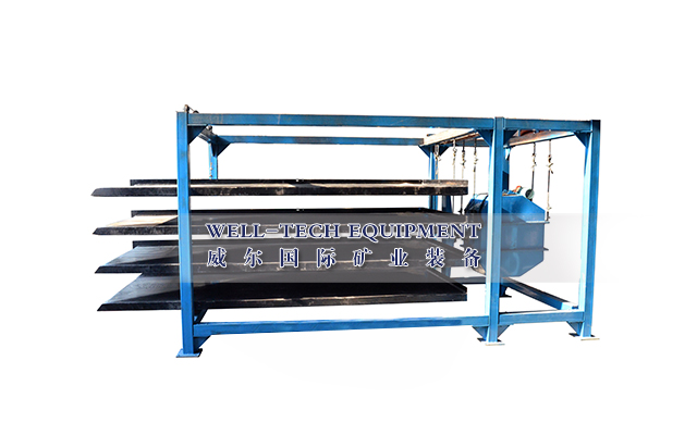 懸掛式搖床床面懸掛而床頭安裝在地面的半懸掛式搖床。采用凸輪杠桿結(jié)構(gòu)的床頭,床面共六層,用鋼絲繩懸掛在機(jī)架上。適用于分選74~19μm的微細(xì)粒金屬礦石。懸面式六層搖床是由座落式六層搖床演變而來(lái)。保留了較適于分選別細(xì)泥的凸輪杠桿式床頭,采用了屜架式懸掛床架,重量輕、每層床面可呈抽屜狀進(jìn)出,床面拆裝方便,它有空間利用率高、動(dòng)力消耗少的優(yōu)點(diǎn)。