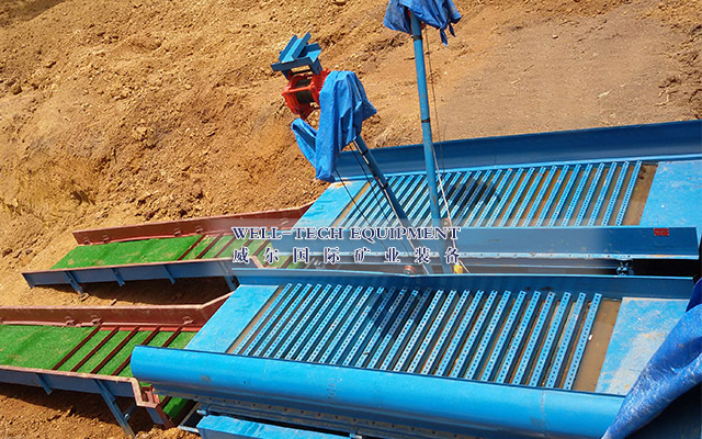 溜金槽又稱鼓動溜槽將原有的鐵制底板改為橡膠底板,再加上簡單的偏心鼓動機構(gòu),使橡膠底板做上、下往復(fù)運動,每個溜格之間類似于跳汰機的隔膜作用。從而解決了溜格的板結(jié)現(xiàn)象,提高了金的回收率。由于溜金槽是間斷排出精礦.
