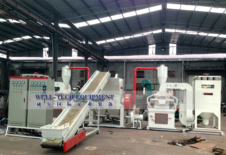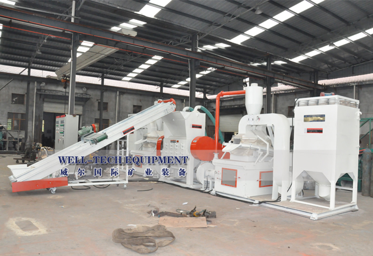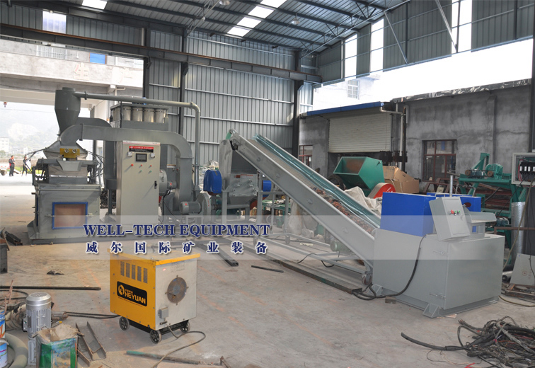 干式銅米機(jī)是專業(yè)干式分離廢舊電線電纜的生產(chǎn)線。例如:舊汽車電路線,通訊電纜線,以及剝線機(jī)不適合加工(各種民用電線)廢舊雜料電線.毛絲細(xì)線等.此機(jī)的特點(diǎn)是大小線不用分類可以同時(shí)破碎分離,結(jié)構(gòu)新型、獨(dú)特,生產(chǎn)量大,耗電少。分選率高,一次投料,多機(jī)協(xié)作完成。全線由PLC控制,在國內(nèi)處于領(lǐng)先水平。該機(jī)的開發(fā)成功,即解決了焚燒取銅方法中出現(xiàn)的問題,又能提高回收銅的質(zhì)量,并可將塑料回收利用,同時(shí)解決環(huán)境的污染。