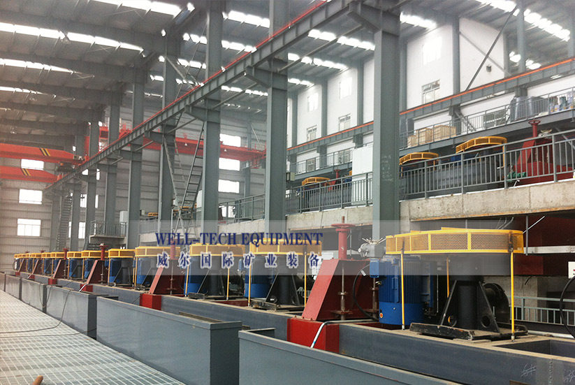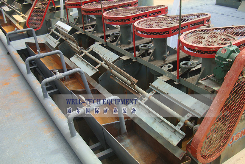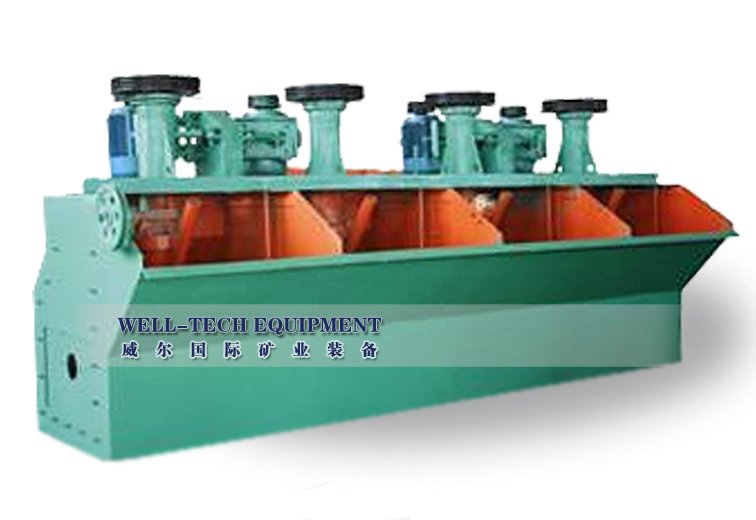 浮選機(jī)用于分離有色金屬、黑色金屬、貴金屬、非金屬礦物和化工原料、回收有用礦物。該浮選設(shè)備具有如下特 點(diǎn):吸氣量大、功耗低。每槽兼有吸氣、吸漿和浮選三重功能,自成浮選回路,不需任何輔助設(shè)備,水平配置,便于流程的變更.礦漿循環(huán)合理,能最大限度地減少粗砂沉淀。設(shè)有礦漿面的自控裝置,調(diào)節(jié)方便 。葉輪帶有后傾式的上下葉片。上葉片產(chǎn)生礦漿上循環(huán),下葉片產(chǎn)生礦漿下循環(huán)。