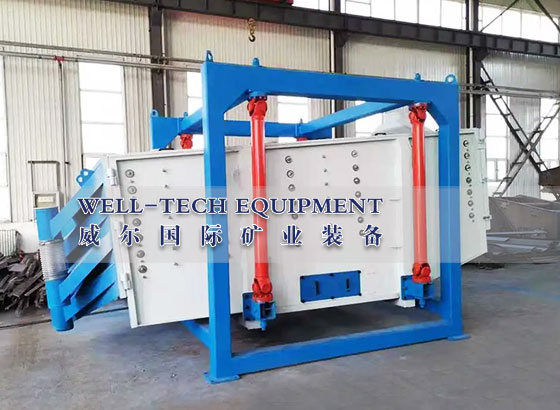 方形搖擺篩的工作原理為:搖擺篩啟動(dòng)后,設(shè)備搖動(dòng)體即篩箱在慣性力的作用下作前后往復(fù)運(yùn)動(dòng),篩箱和篩面連體作周期性搖動(dòng),從而使篩面上的物料隨篩箱一同作定向跳躍式運(yùn)動(dòng)。期間,小于篩孔的物料通過(guò)篩孔落到下層,成為篩下物,大于篩孔孔徑的物料經(jīng)連續(xù)翻滾跳躍運(yùn)動(dòng)后從排料口排出,從而完成篩分工作。