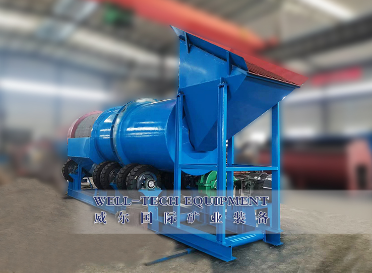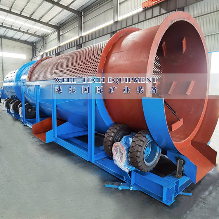 圓筒洗礦機(jī)利用旋轉(zhuǎn)的圓筒和內(nèi)部的刮板以及物料中自有的卵石和巖石來(lái)分解粘土,塊狀物和軟氧化物。洗礦機(jī)的圓筒慢慢地旋轉(zhuǎn),類似于一個(gè)巨大的洗衣機(jī)。粗細(xì)不同的物料還有水同時(shí)在一起翻滾攪動(dòng),有效地把有用礦物從泥性土壤,粘土中釋放出來(lái)。分散均勻后漿狀般的物料被圓筒送到尾端,并從溢流口排到錐形篩進(jìn)行篩分。錐形篩把大于有用礦物的粒度的物料排除,篩下的礦漿即可直接進(jìn)入各種各樣的選礦設(shè)備,如離心選礦機(jī),螺旋溜槽,跳汰機(jī)等。