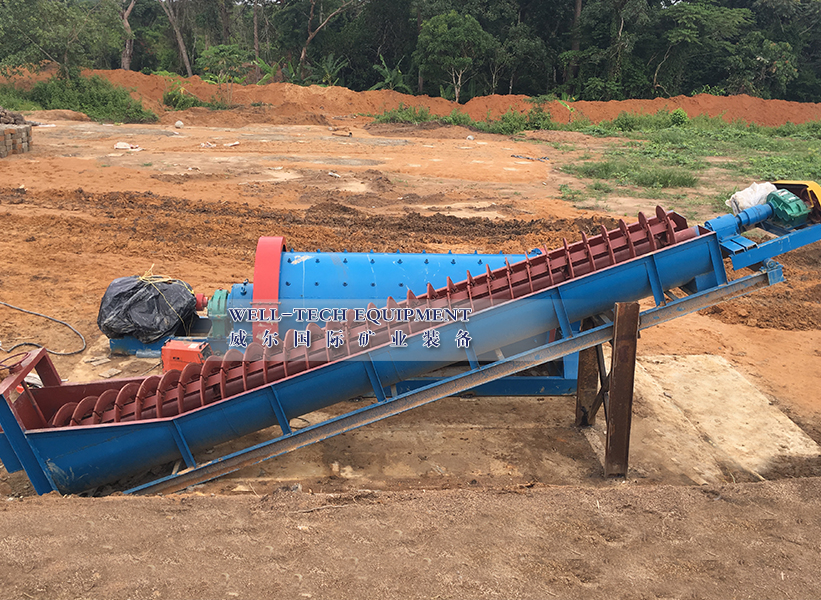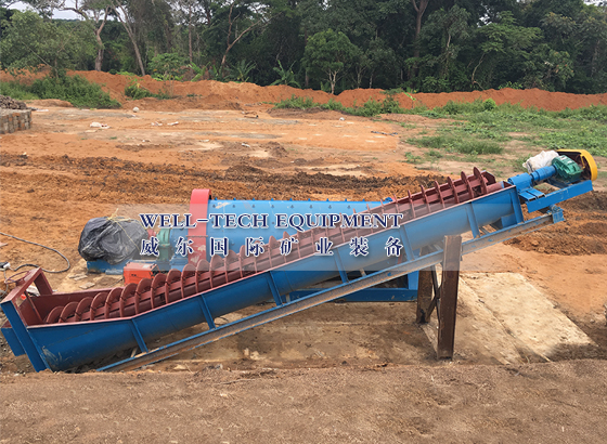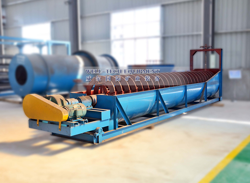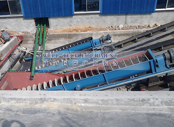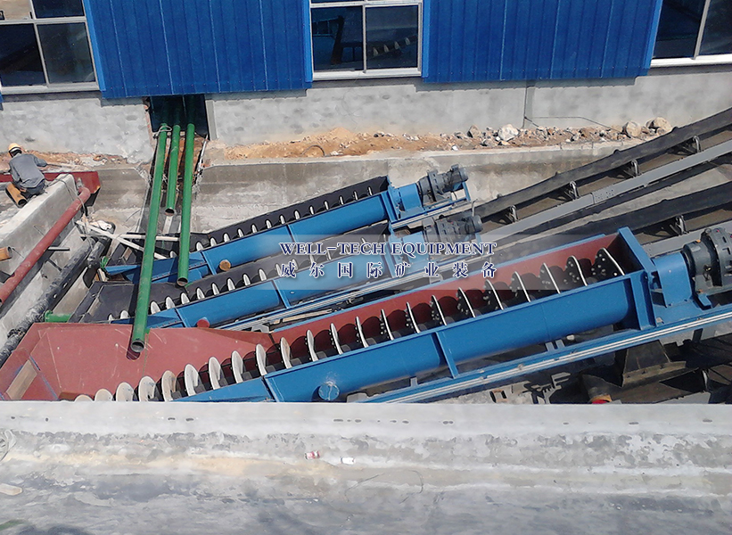 螺旋分級機(jī)在選礦廠用于同磨礦機(jī)組成閉路工作的分級機(jī),需要有提升運(yùn)輸沉砂的機(jī)構(gòu),因此這類分級機(jī)被稱為機(jī)械分級機(jī),其實(shí)分級過程仍是借顆粒的沉降速度不同進(jìn)行的。機(jī)械分級機(jī)除主要作為磨礦的輔助設(shè)備進(jìn)行預(yù)先分級和檢查分級外,有時也用于對含黏土礦石進(jìn)行洗礦以及對礦將進(jìn)行脫泥、脫水。 根據(jù)運(yùn)輸沉砂機(jī)械的形式不同,機(jī)械分級機(jī)可分為螺旋分級機(jī)、耙式分級機(jī)和浮槽分級機(jī)等。其中螺旋分級機(jī)構(gòu)造簡單,操作方便,分級槽具有較大的傾斜角度,便于同磨礦機(jī)作自流連接,故應(yīng)用較普遍。其他形式的分級機(jī)雖在我國仍有使用,但已停止制造。螺旋分級機(jī)的外形是一個矩形斜槽,槽底傾角為12°~18.5°,底部呈半圓形。槽內(nèi)安裝有1或2個縱長的軸,沿軸長連續(xù)地安置螺旋形葉片。借上端傳動機(jī)構(gòu)帶動螺旋軸旋轉(zhuǎn)。如為雙螺旋,從上部來看螺旋葉片均是向外轉(zhuǎn)動。礦漿由槽的旁側(cè)給入。在槽的下部形成沉降分級面。粗顆粒沉到槽底然后被螺旋推向上方排出,在運(yùn)輸過程中并進(jìn)行脫水。未及沉降的細(xì)顆被表層礦漿流攜帶經(jīng)溢堰排出。分級過程與在分泥斗中基本相同。在分級槽下端有一個框架??蚣艿纳喜繖M梁設(shè)有提升裝置,用以調(diào)節(jié)螺旋葉片距槽底的距離,并在停車時將螺旋軸抬起,以防止礦砂沉積埋住螺旋葉片。 螺旋分級機(jī)分級液面的高低又可分為高堰式和浸入式(或稱沉沒式)兩種。高堰式分級機(jī)的溢流堰高于下端螺旋軸的中心,而低于螺旋葉片的上緣。分級液面的長度不大,液面可直接感受到螺旋葉片上的攪動作用,故適于粗級分級作用,分級粒度多在0.15mm以上。浸入式分級機(jī)的下端螺旋葉片完全浸入在液面以下,分級面積大而又平穩(wěn),適于細(xì)粒級分級,分級粒度在0.15mm以下。它的溢流生產(chǎn)率較高。此外還有一種低堰式螺旋分級機(jī),其分級液面低于下端螺旋軸承,液面很小,攪動作用大,主要用于含泥砂石的洗礦。